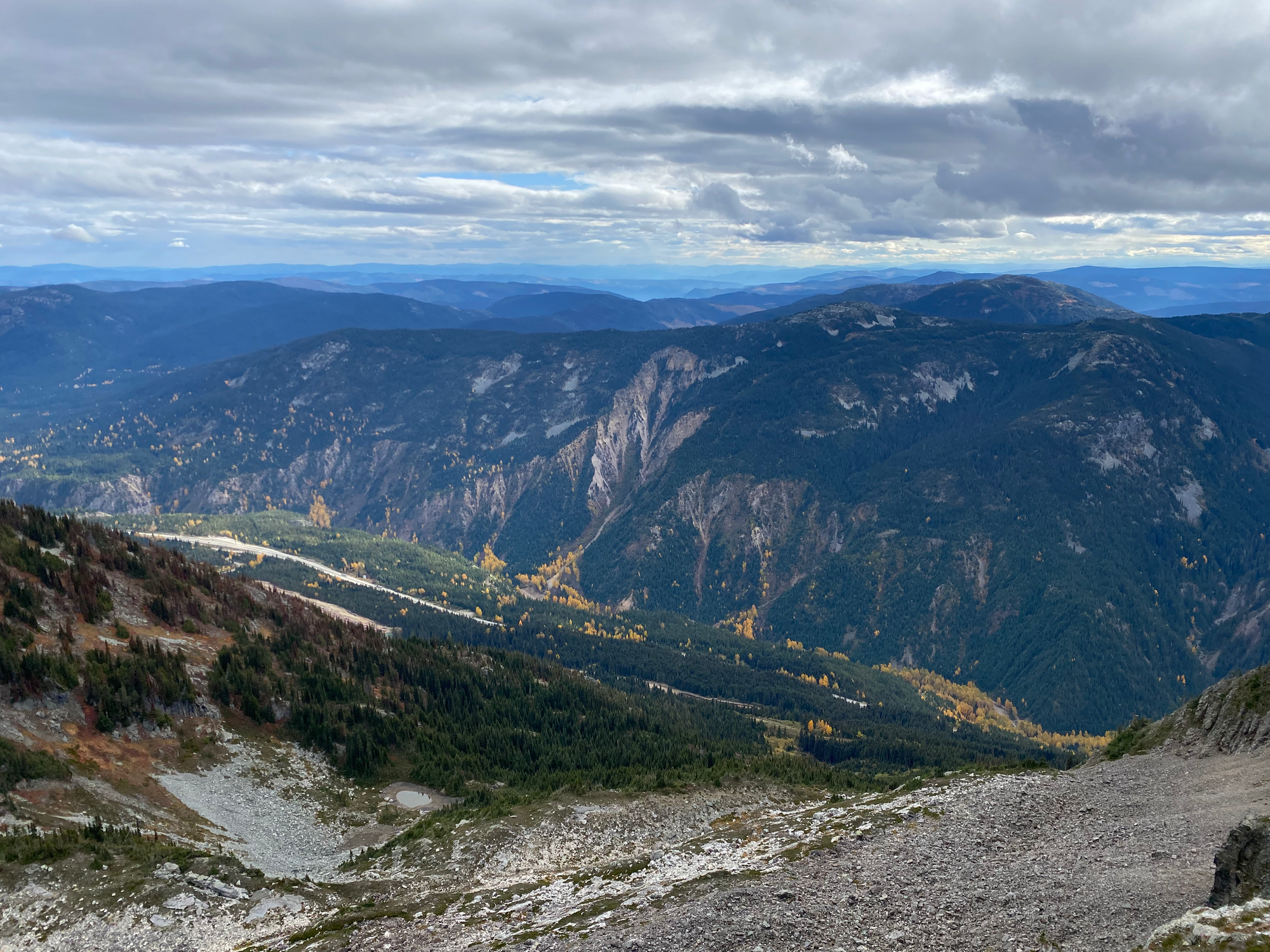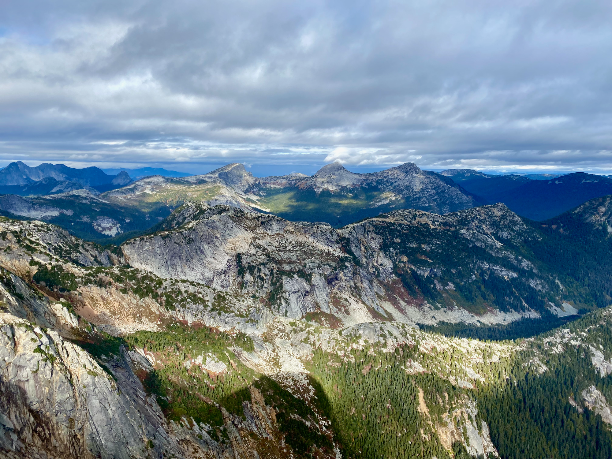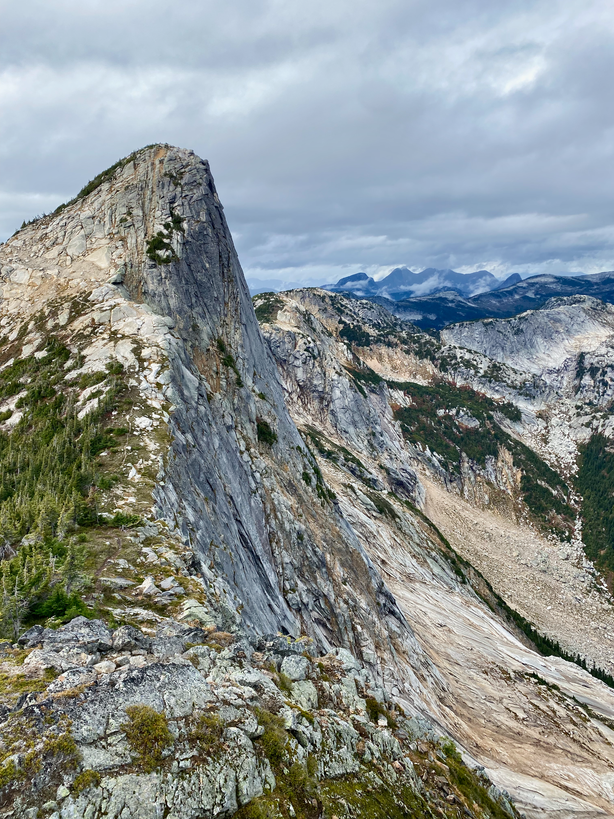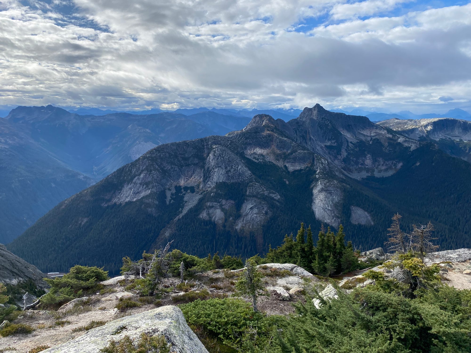 I visited the south summit first, taking a class ⅔ route instead of the normal trail. From there the north (higher) summit was a couple hundred metres walk away. Both summits, especially the north one, had excellent views of the valley and the crazy granite horns this area is known for, such as the Anderson River Group.